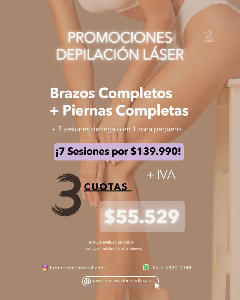 Incluye: 7 sesiones Piernas completas y Brazos completos + 3 sesiones de regalo en una zona pequeña a elección.